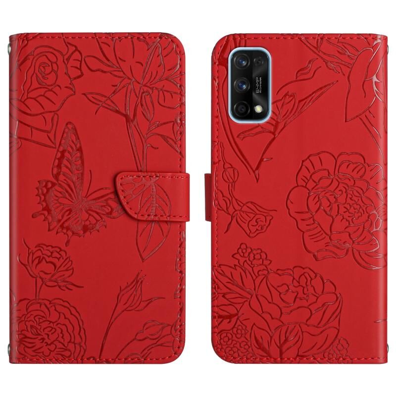 Θήκη τηλεφώνου από δέρμα με ανάγλυφο σχέδιο πεταλούδας και παιωνίας για OPPO Realme 7 Pro (Κόκκινο)