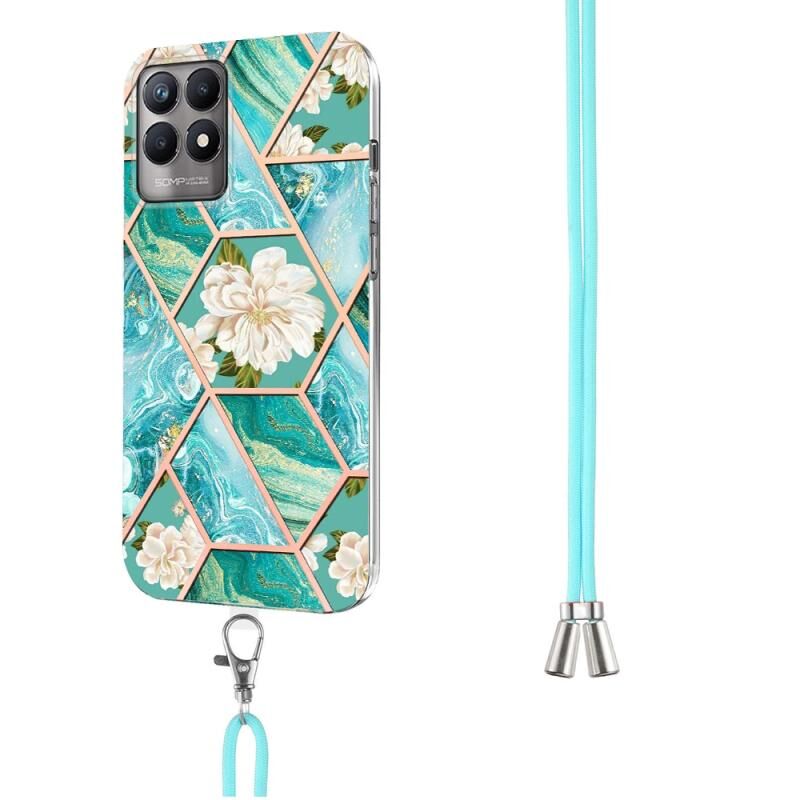 Θήκη τηλεφώνου TPU με σχέδιο μαρμάρου και λουλουδιών patchwork για OPPO Realme 8i με κορδόνι (Ροζ Λουλούδι)