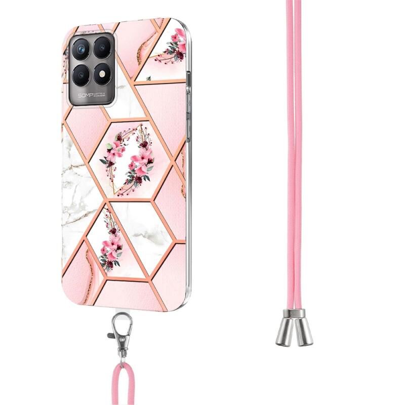 Θήκη τηλεφώνου TPU με σχέδιο μαρμάρου και λουλουδιών patchwork για OPPO Realme 8i με κορδόνι (Ροζ Λουλούδι)