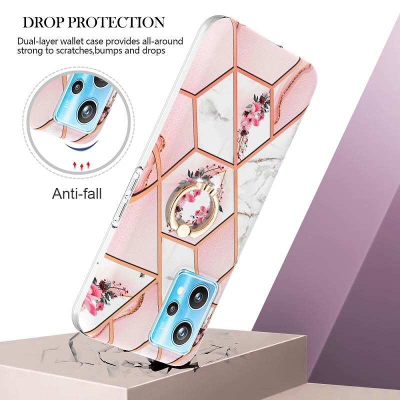 Θήκη για OPPO Realme 9 Pro+ 5G, από TPU με σχέδιο μαρμάρου και λουλουδιών σε patchwork, με δακτύλιο στήριξης (Ροζ Λουλούδι)