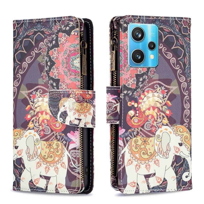 Θήκη τηλεφώνου από δέρμα με φερμουάρ και πολύχρωμο σχέδιο για OPPO Realme 9 Pro+ (Λουλούδια και Ελέφαντες)