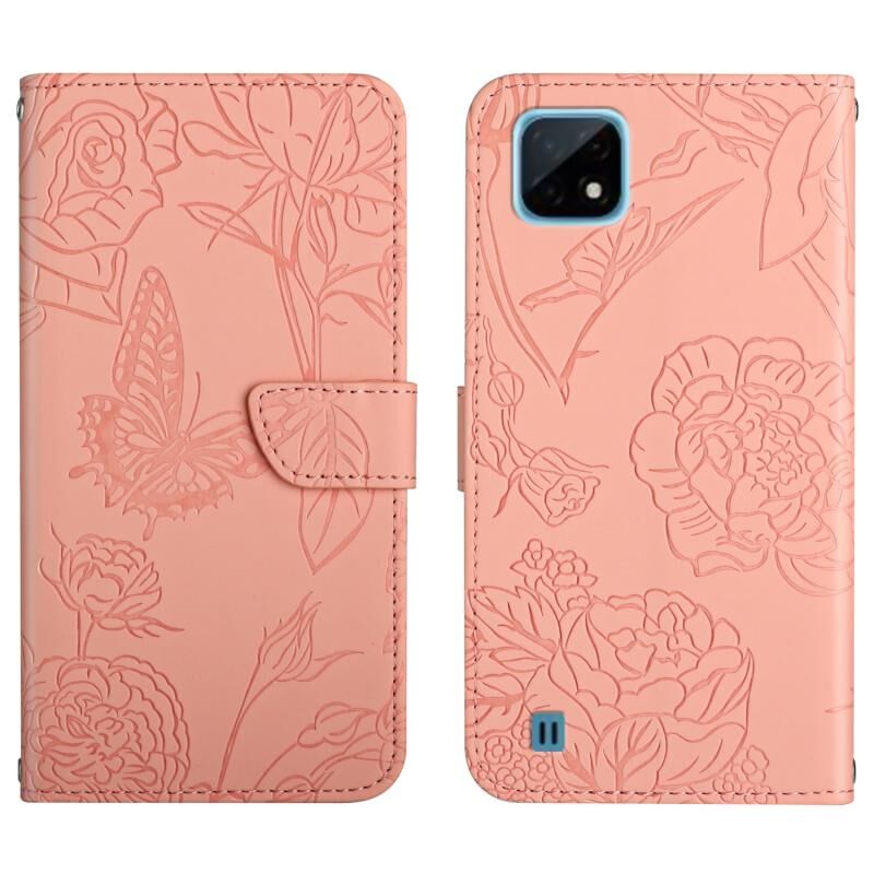 Θήκη τηλεφώνου από δέρμα με ανάγλυφο σχέδιο πεταλούδας και παιωνίας για OPPO Realme C11 (Κόκκινο)