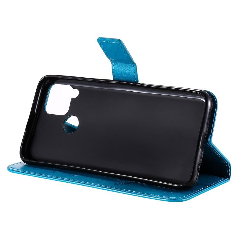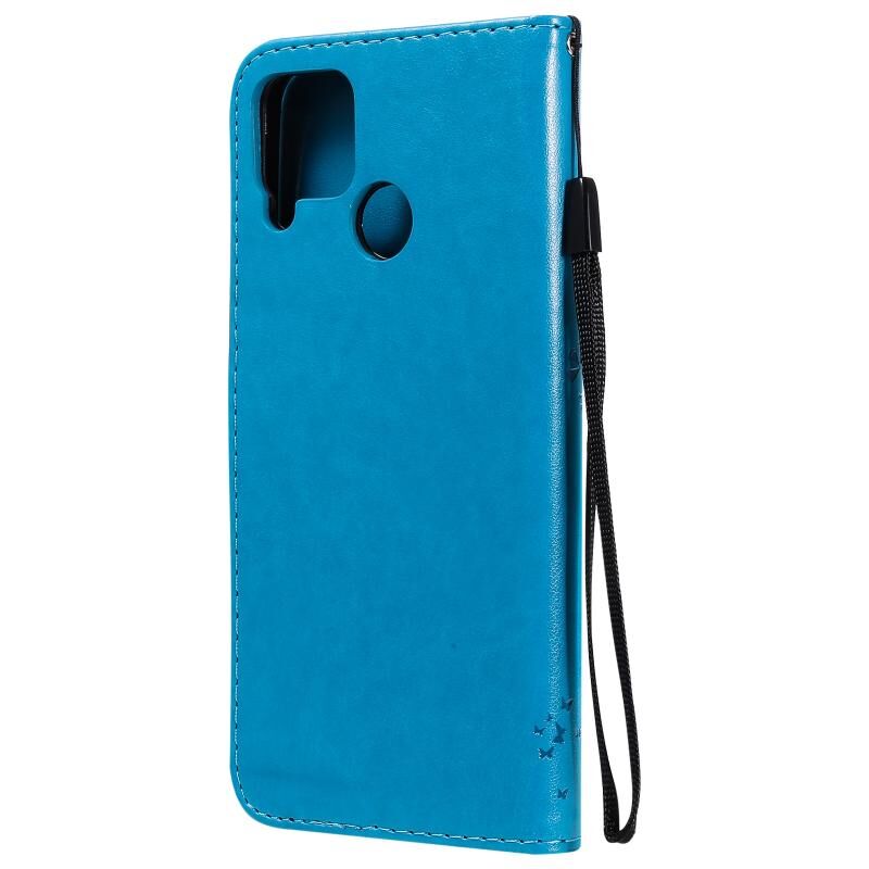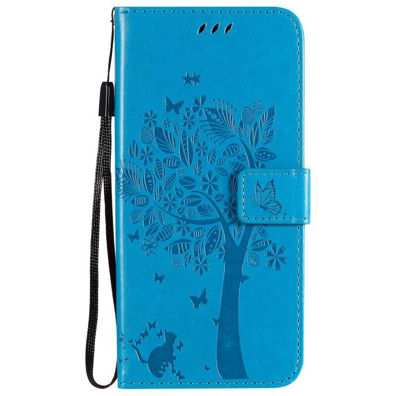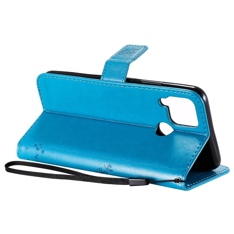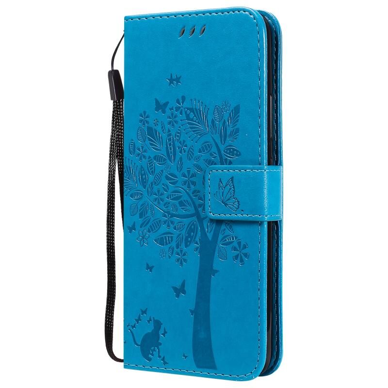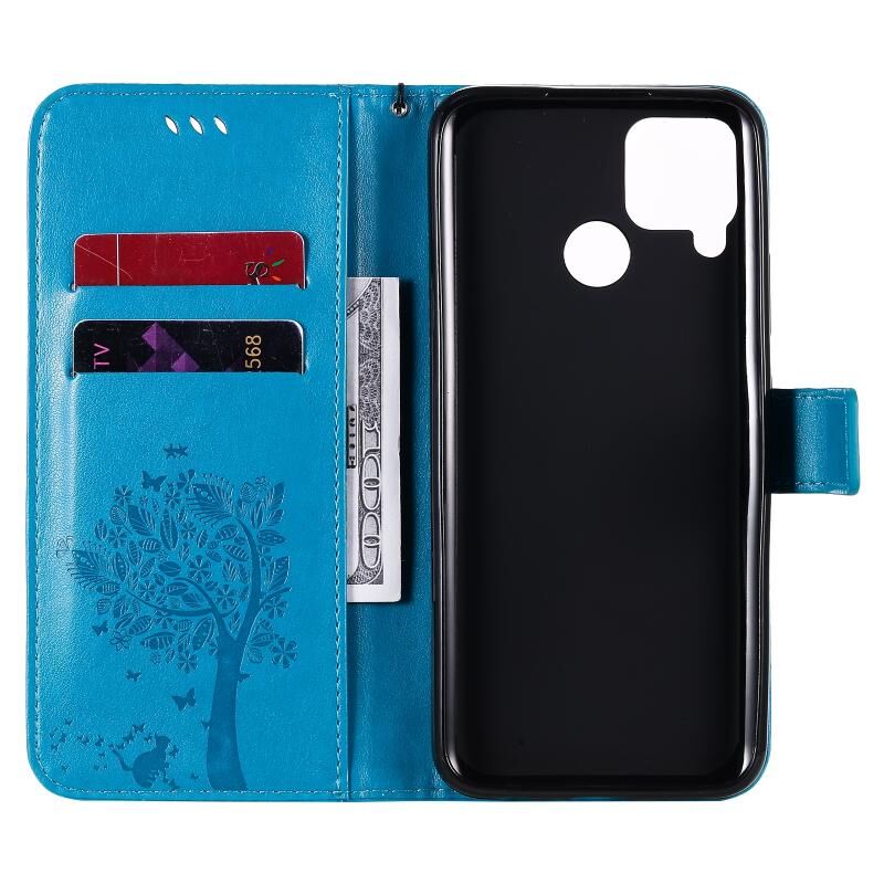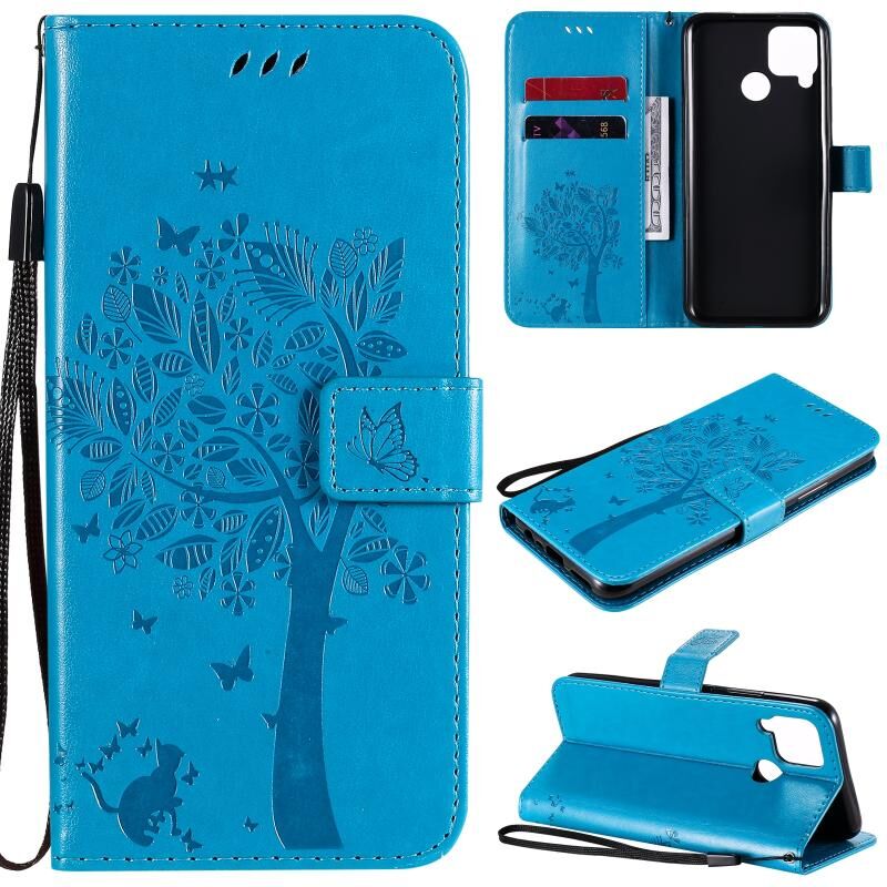 For OPPO Realme C12 / C15 Tree & Cat Embossed Pattern Horizontal Flip Leather Case with Holder & Card Slots & Wallet & Lanyard(Blue)