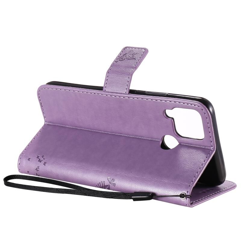 For OPPO Realme C12 / C15 Tree & Cat Embossed Pattern Horizontal Flip Leather Case with Holder & Card Slots & Wallet & Lanyard(Light Purple)