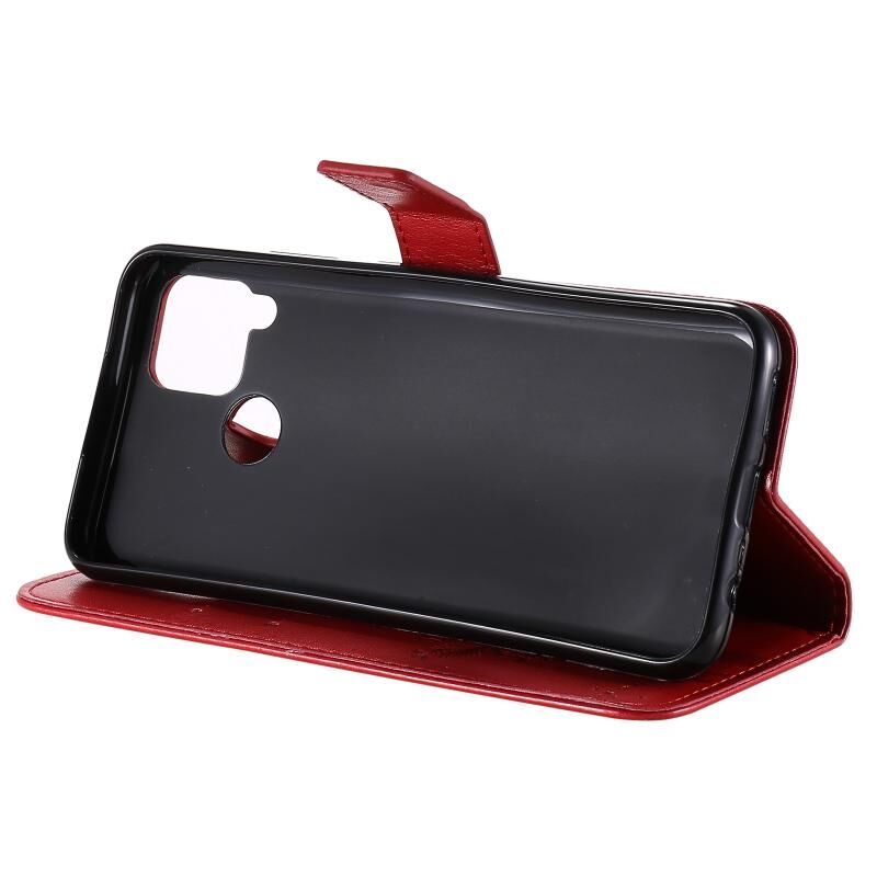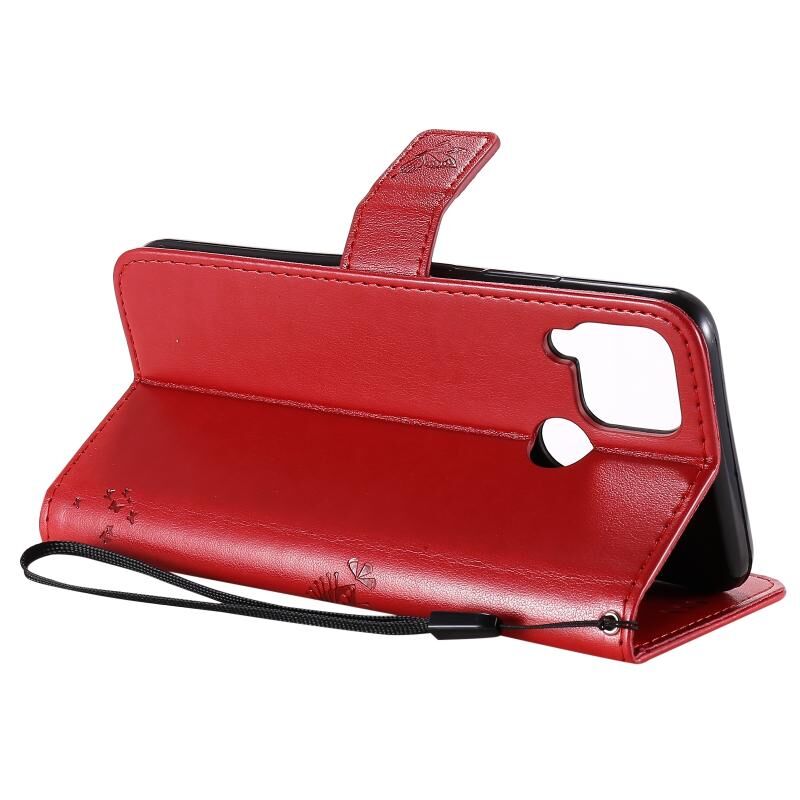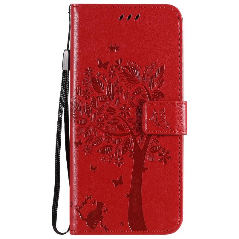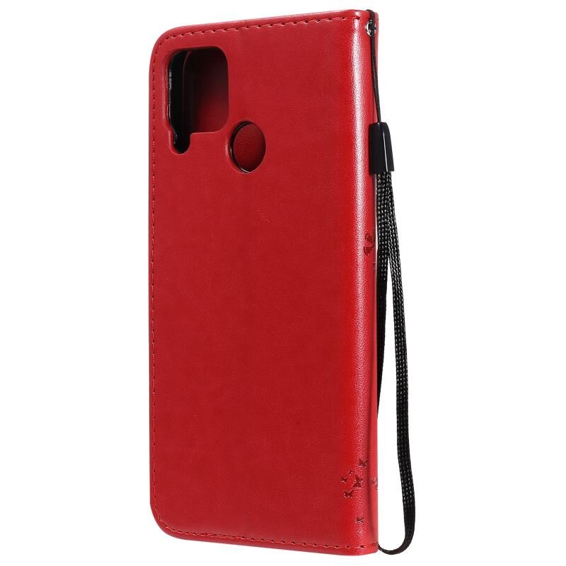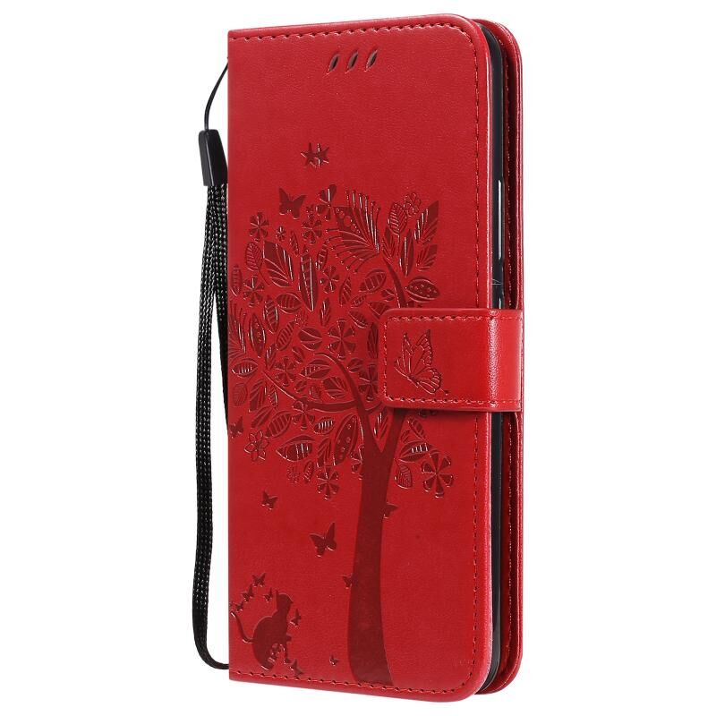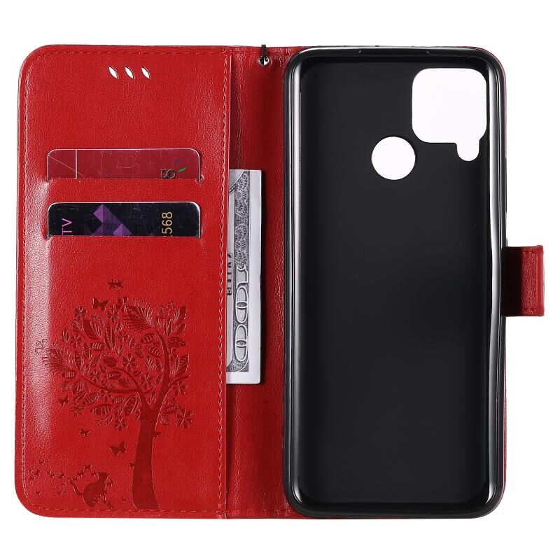For OPPO Realme C12 / C15 Tree & Cat Embossed Pattern Horizontal Flip Leather Case with Holder & Card Slots & Wallet & Lanyard(Red)