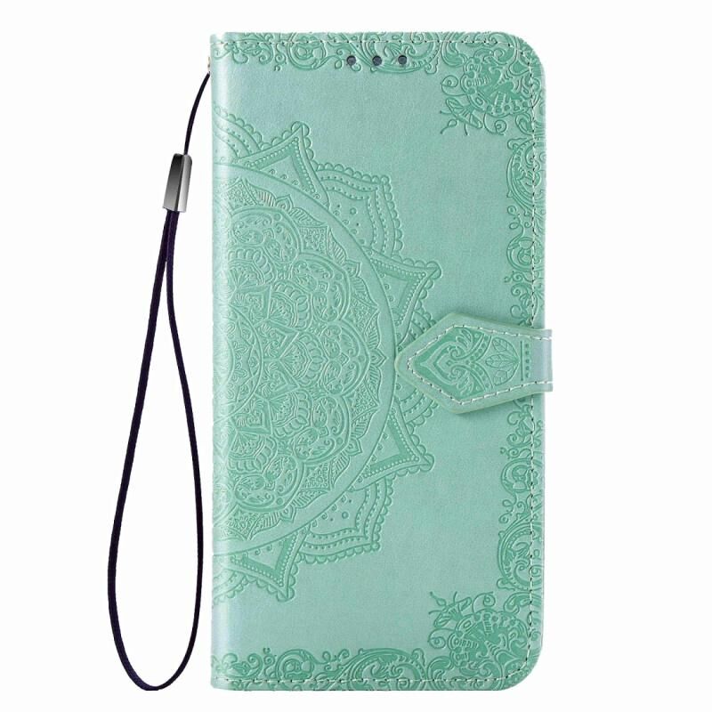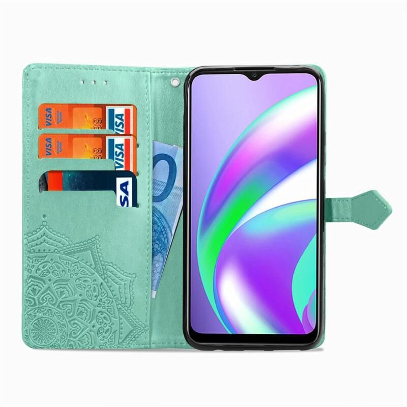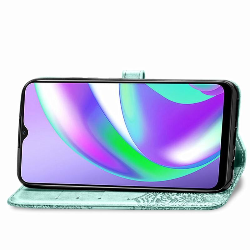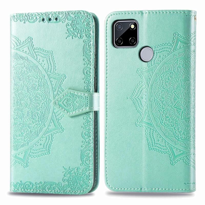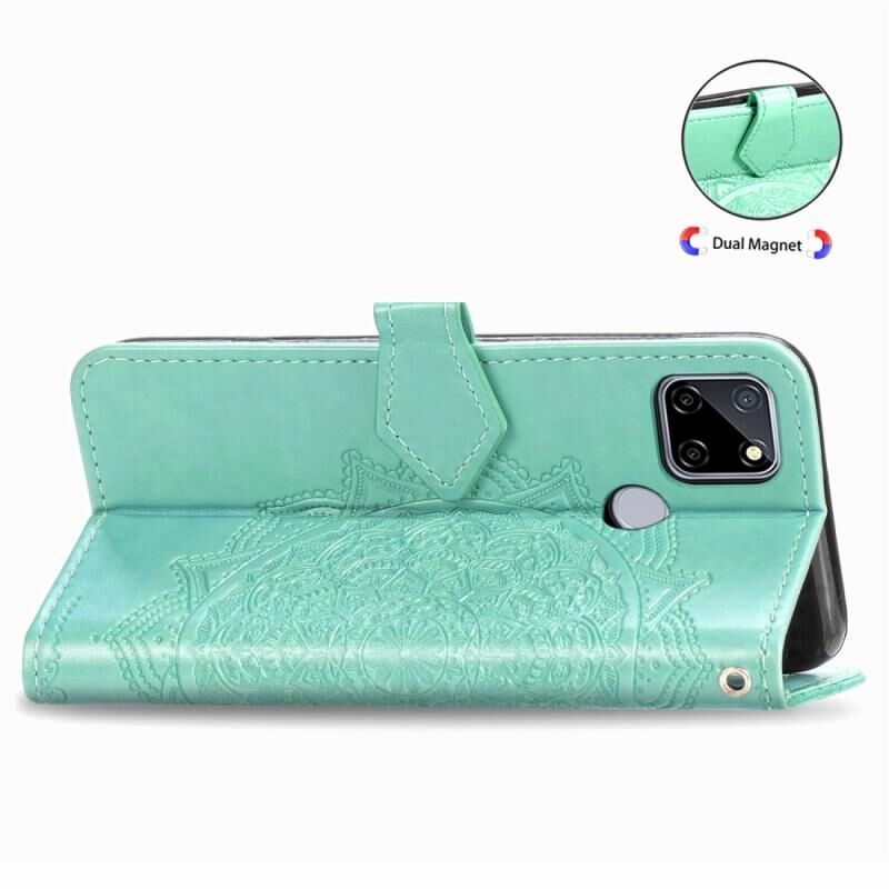 Θήκη δέρματος οριζόντιας αναδίπλωσης για OPPO Realme C12 με ανάγλυφο σχέδιο Mandala, λουλουδιών, με βάση στήριξης / υποδοχή κάρτας / πορτοφόλι / κορδόνι (Μαύρο)