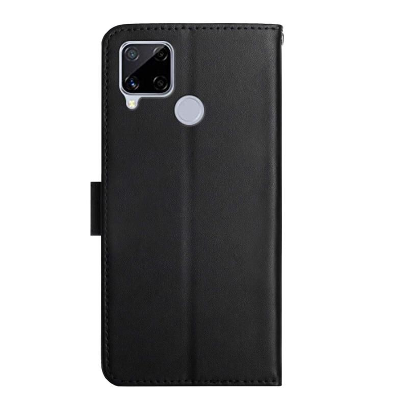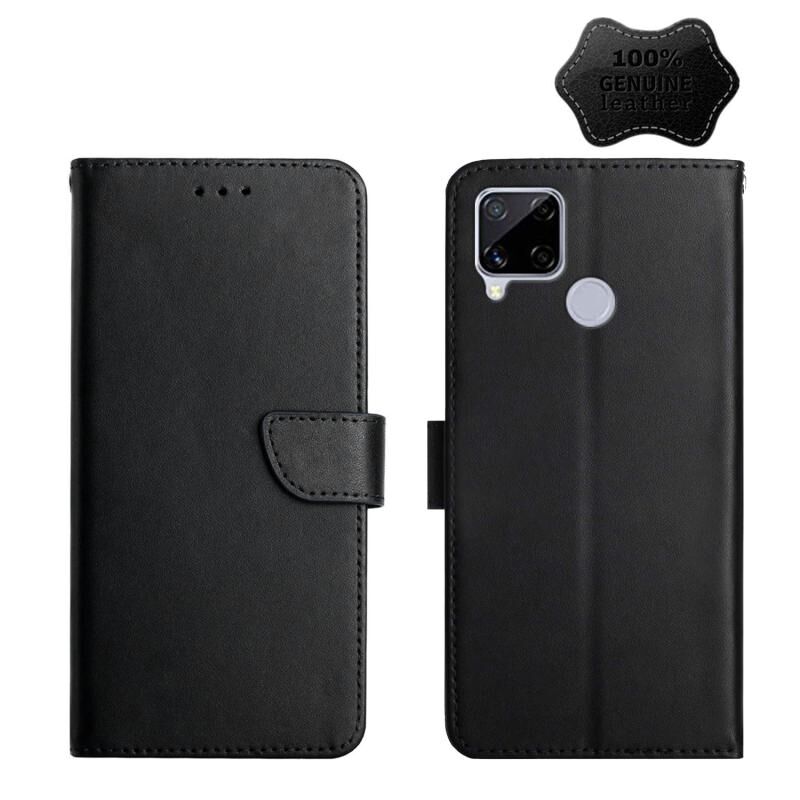 Θήκη τηλεφώνου οριζόντιας αναδίπλωσης από γνήσιο δέρμα για OPPO Realme C15, ανθεκτική στα δακτυλικά αποτυπώματα (Μαύρο)