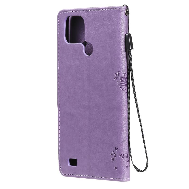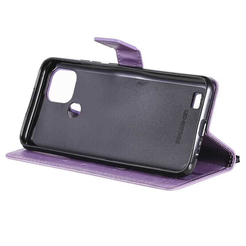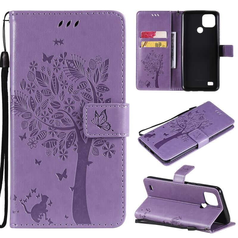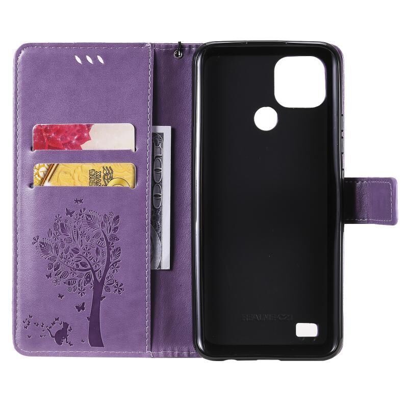 Θήκη για OPPO Realme C21 / C20 με σχέδιο Δέντρου & Γάτας, εκτυπωμένη με ανάγλυφο, οριζόντια αναδίπλωση, από δερματίνη PU με βάση στήριξης & θήκες καρτών & πορτοφόλι & κορδόνι (Ανοιχτό Μωβ)