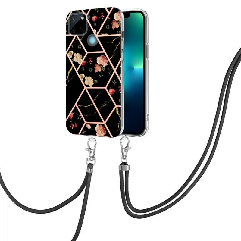 Θήκη τηλεφώνου TPU με σχέδιο μαρμάρου και λουλουδιών για OPPO Realme C21Y με κορδόνι (Ροζ Λουλούδι)