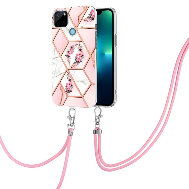 Θήκη τηλεφώνου TPU με σχέδιο μαρμάρου και λουλουδιών για OPPO Realme C21Y με κορδόνι (Ροζ Λουλούδι)