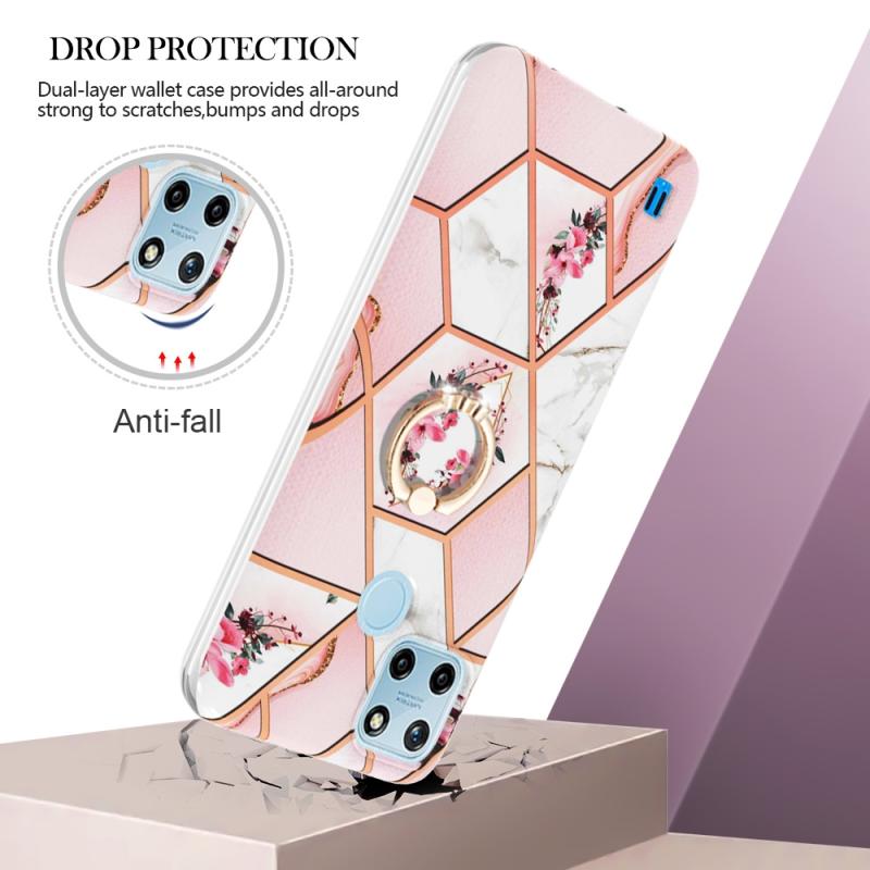 For OPPO Realme C21Y Splicing Marble Flower Pattern TPU Ring Holder Case(Pink Flower)