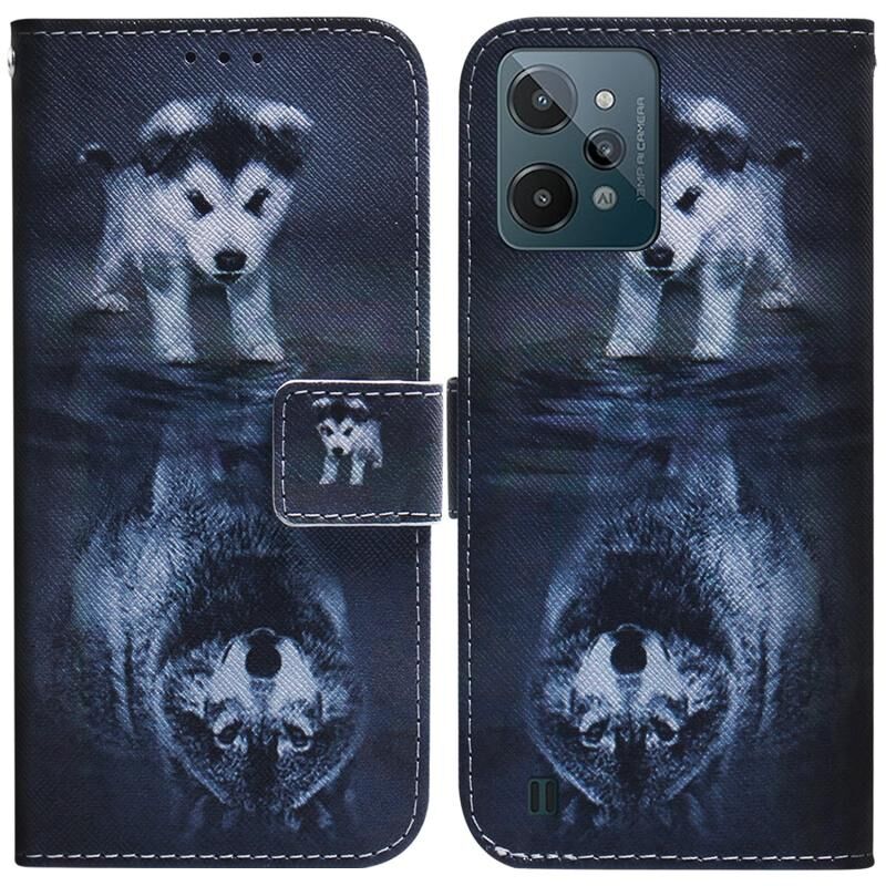 Θήκη τηλεφώνου από δέρμα με έγχρωμο σχέδιο για OPPO Realme C31 (Λύκος και Σκύλος)