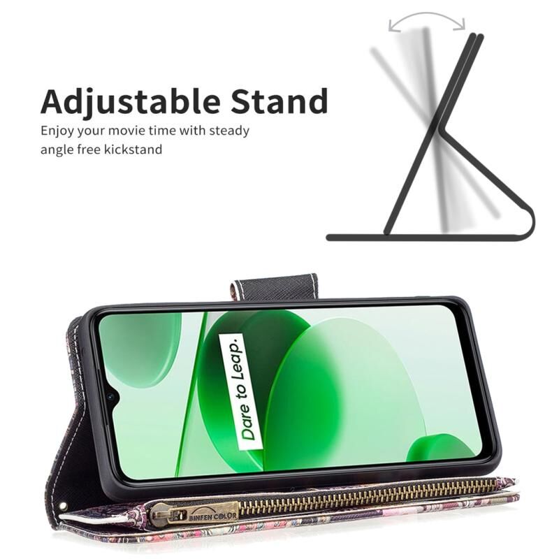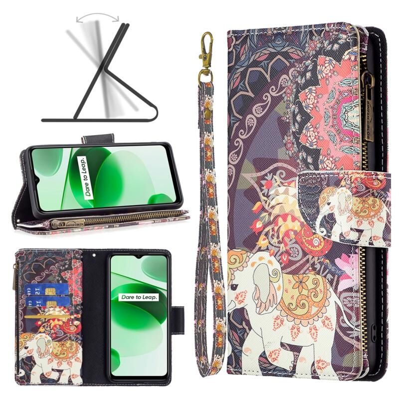 Θήκη τηλεφώνου από δέρμα με φερμουάρ και πολύχρωμο σχέδιο για OPPO Realme C35 (Λουλούδια και Ελέφαντες)