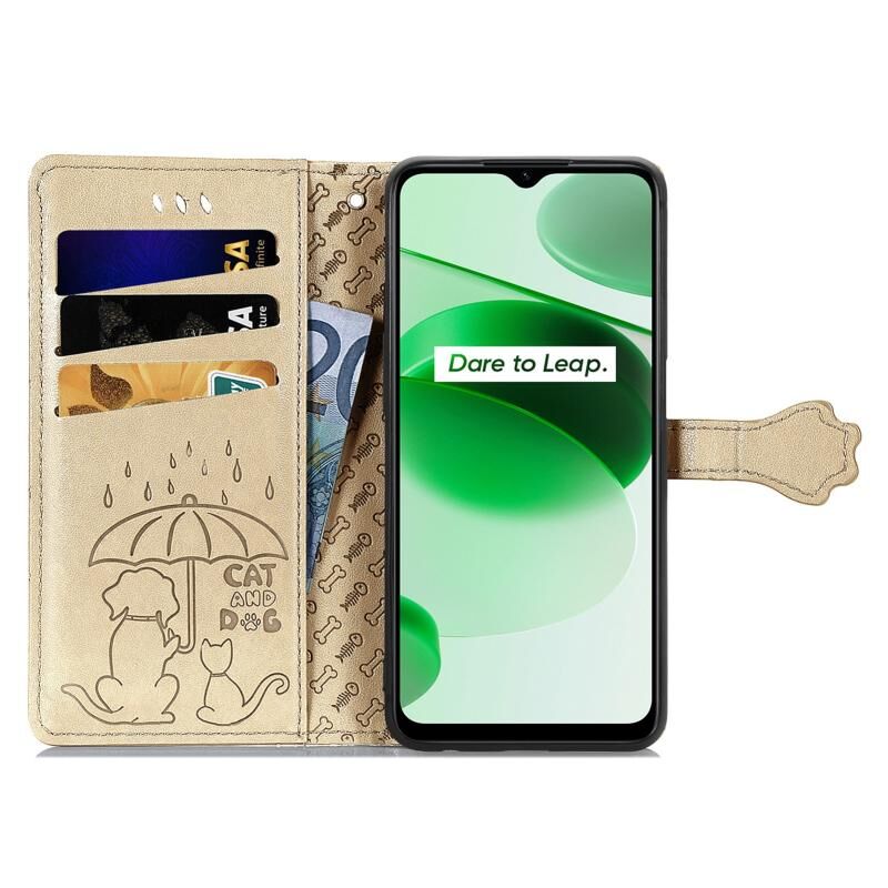 Θήκη τηλεφώνου από δέρμα με ανάγλυφα σχέδια χαριτωμένων γάτας και σκύλου για OPPO Realme C35 (Μπλε)