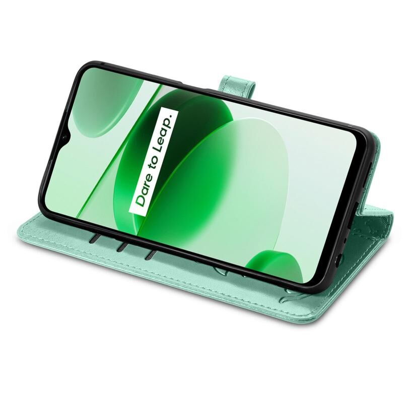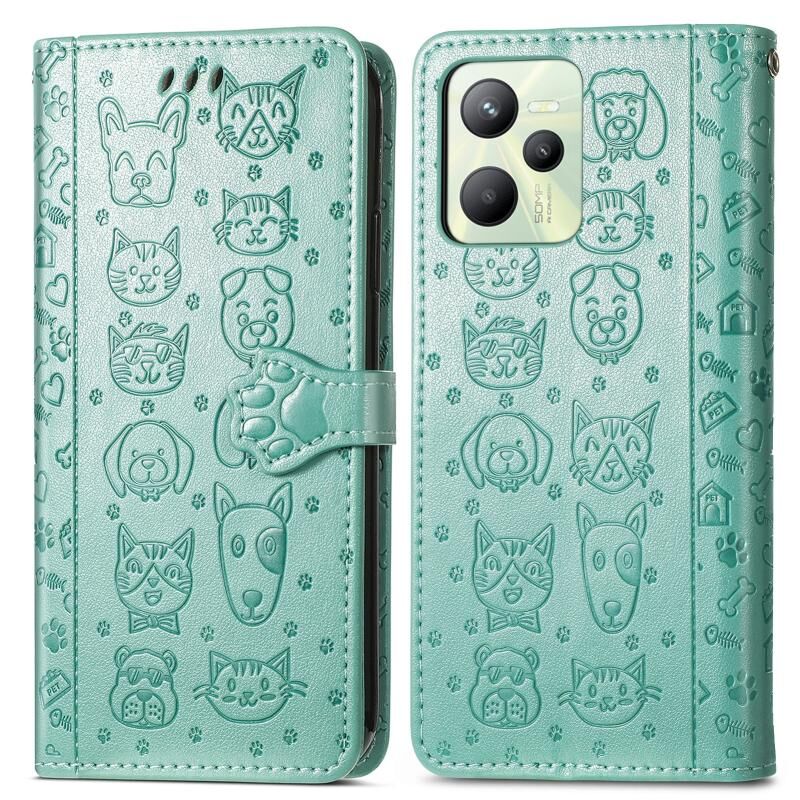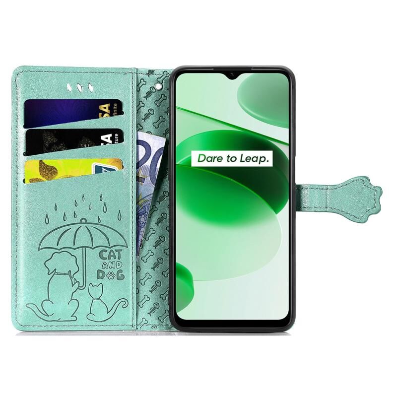 Θήκη τηλεφώνου από δέρμα με ανάγλυφα σχέδια χαριτωμένων γάτας και σκύλου για OPPO Realme C35 (Μπλε)
