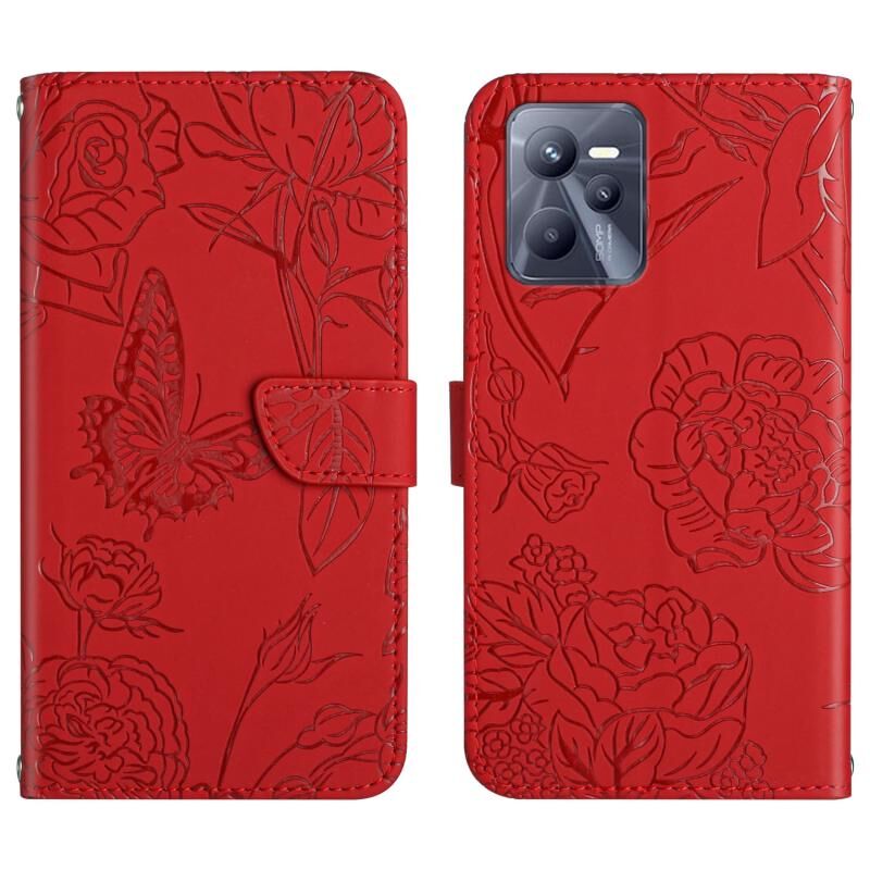Θήκη τηλεφώνου από δέρμα με ανάγλυφο σχέδιο πεταλούδας και παιώνιας για OPPO Realme C35 (Κόκκινο)