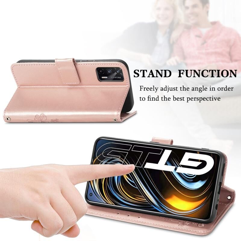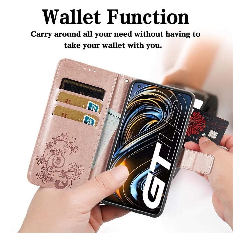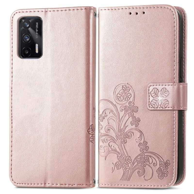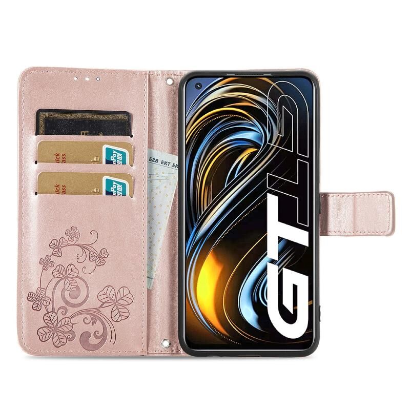 Για OPPO Realme GT 5G / Q3 Pro 5G Θήκη Προστασίας Δερμάτινη για Κινητό με Κούμπωμα Τριφυλλιού, Λουράκι, Θήκη Καρτών, Πορτοφόλι & Λειτουργία Στήριξης (Χρυσό Ρόδι)