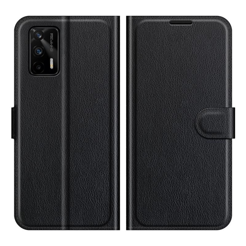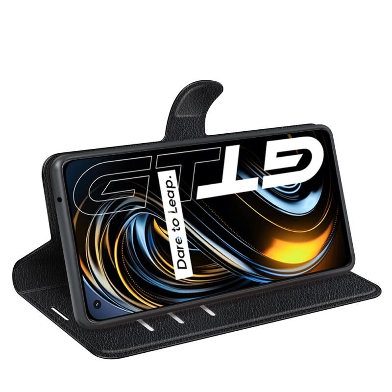 Θήκη προστασίας οριζόντιας αναδίπλωσης με υφή λitchi για OPPO Realme GT 5G / Realme Q3 Pro 5G με βάση στήριξης & υποδοχές καρτών & πορτοφόλι (Μαύρο)