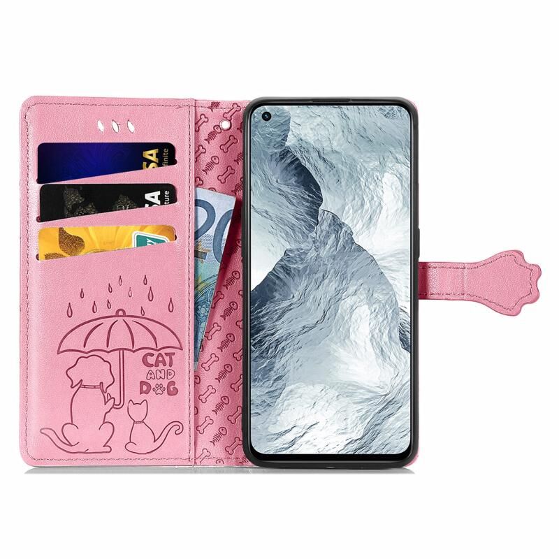 Θήκη δέρματος οριζόντιας αναδίπλωσης για OPPO Realme GT Master με χαριτωμένο σχέδιο ανάγλυφου γάτας και σκύλου, με βάση στήριξης & υποδοχές καρτών & πορτοφόλι & κούμπωμα καρτούν & κορδόνι (Μωβ)