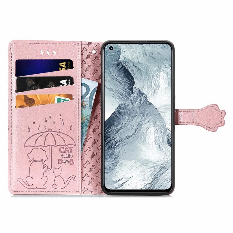 Θήκη δέρματος οριζόντιας αναδίπλωσης για OPPO Realme GT Master με χαριτωμένο σχέδιο ανάγλυφου γάτας και σκύλου, με βάση στήριξης & υποδοχές καρτών & πορτοφόλι & κούμπωμα καρτούν & κορδόνι (Μωβ)