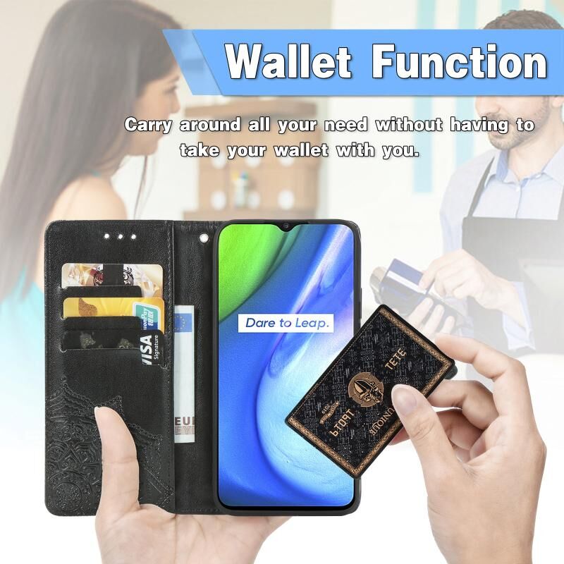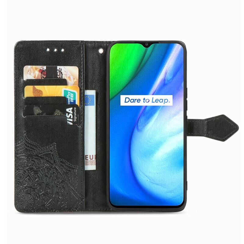 Θήκη δέρματος οριζόντιας αναδίπλωσης για OPPO Realme V3 με ανάγλυφο σχέδιο Mandala, με βάση στήριξης & τρεις θήκες για κάρτες & πορτοφόλι & λουρί (Μαύρο)