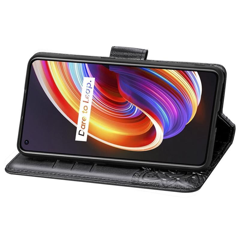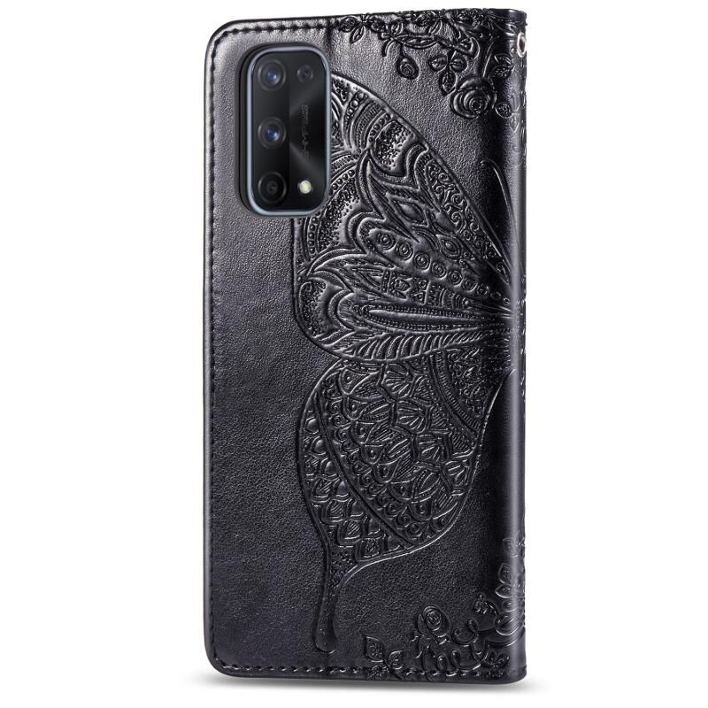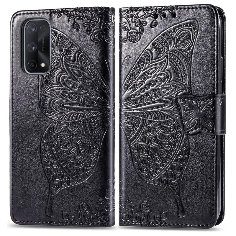 Θήκη δέρματος οριζόντιας αναδίπλωσης για OPPO Realme X7 με ανάγλυφο σχέδιο πεταλούδας, λουλουδιών, βάση στήριξης / υποδοχή κάρτας / πορτοφόλι / κορδόνι (Μαύρο)