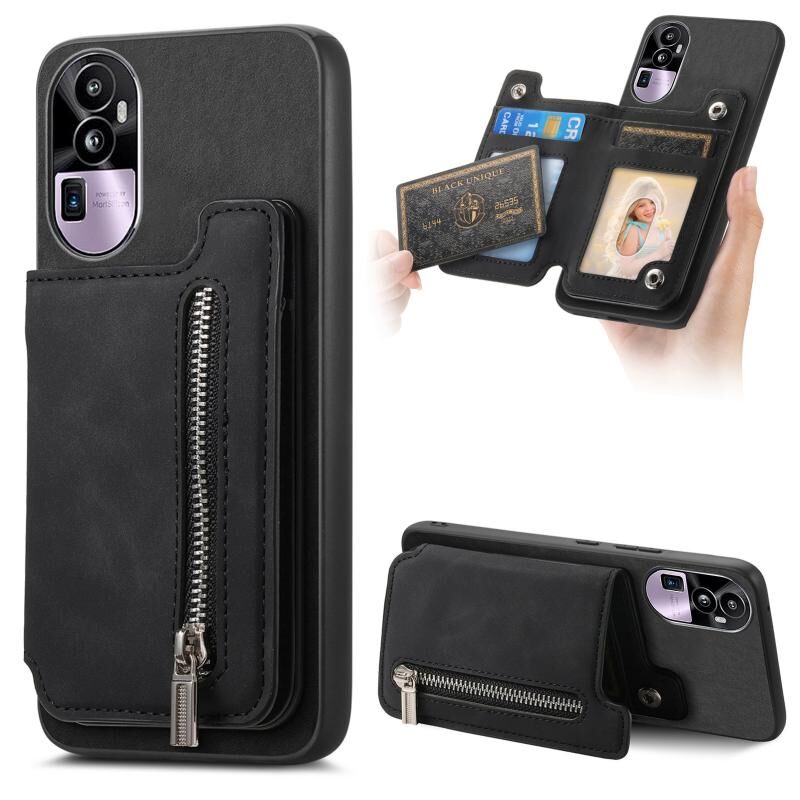 Θήκη κινητού τηλεφώνου για OPPO Reno10 Pro+ 5G, Ρετρό, με μαγνητική σύνδεση MagSafe, θήκη πορτοφολιού με φερμουάρ και θήκη για κάρτες (Μαύρο)
