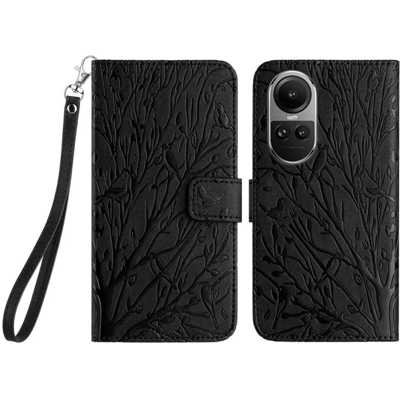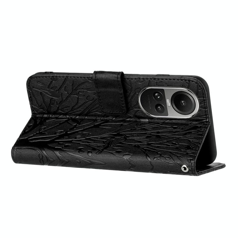 For OPPO Reno10 Pro Global Tree Birds Embossed Pattern Leather Phone Case(Black)
