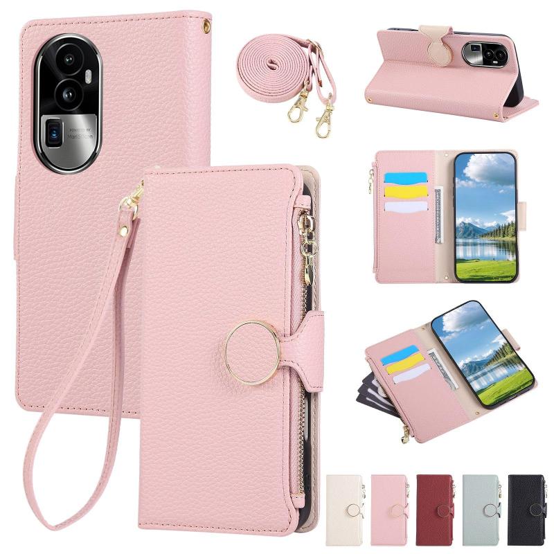 For OPPO Reno10 Pro+ Round Buckle Zipper Wallet Leather Phone Case with Crossbody Strap(Pink)