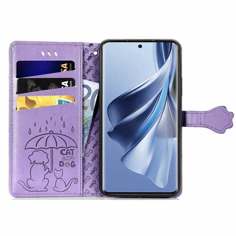 Θήκη τηλεφώνου από δέρμα με ανάγλυφο σχέδιο γάτας και σκύλου για OPPO Reno10 / Reno10 Pro Global (Μωβ)