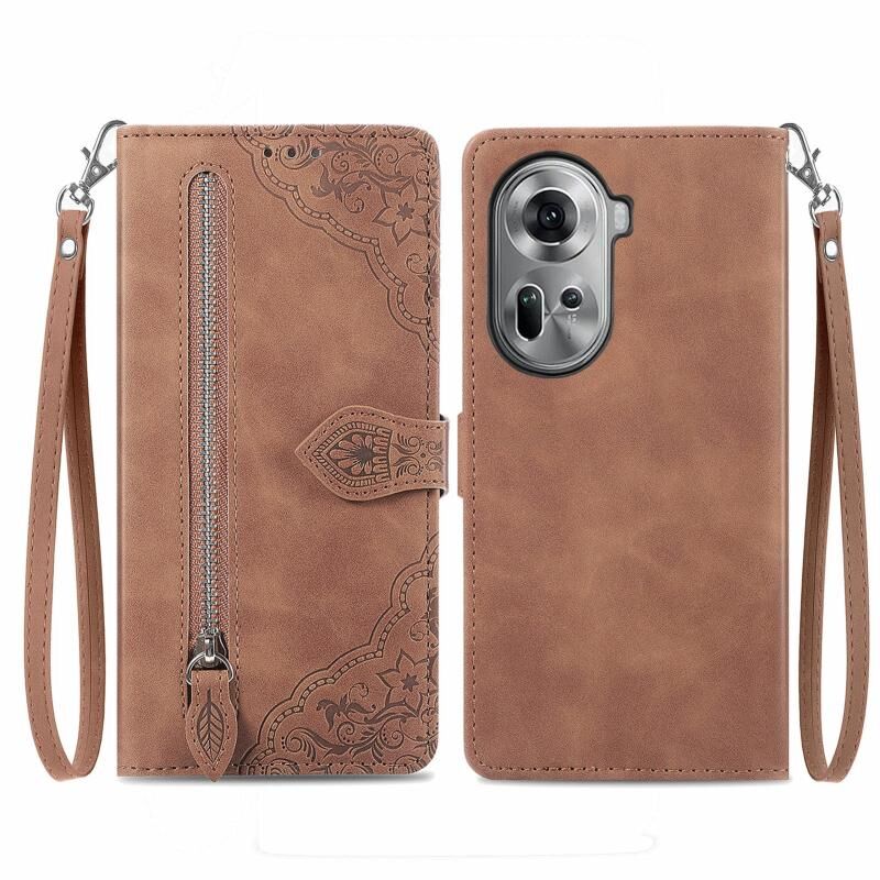 Για OPPO Reno11 5G ΕΕ ανάγλυφο λουλούδι φερμουάρ δερμάτινη θήκη τηλεφώνου (καφέ)
