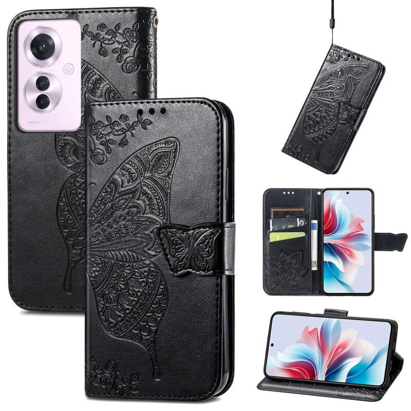 Θήκη τηλεφώνου από δέρμα με ανάγλυφο σχέδιο πεταλούδας και λουλουδιών για OPPO Reno11 F 5G (Σκούρο Μωβ)