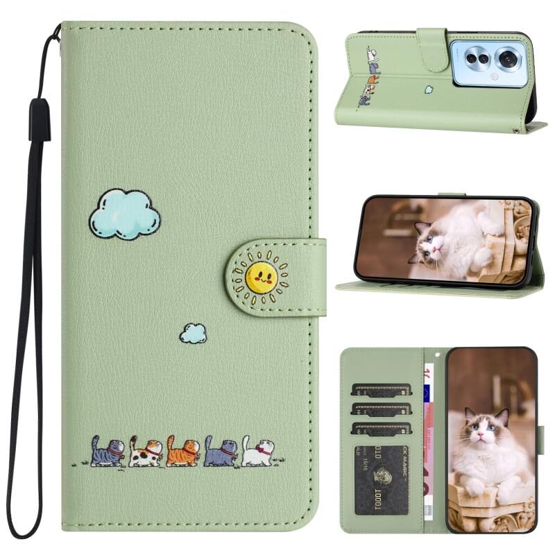 Θήκη τηλεφώνου από δέρμα με σχέδια καρτούν γάτας για OPPO Reno11 F (πράσινο)