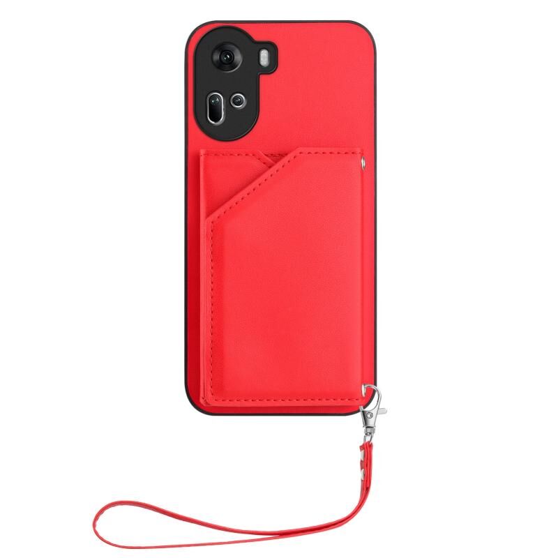 Για OPPO Reno11 Παγκόσμια αίσθηση δέρματος Τέσσερις υποδοχές καρτών τηλέφωνο υπόθεση με λουράκι καρπού (κόκκινο)