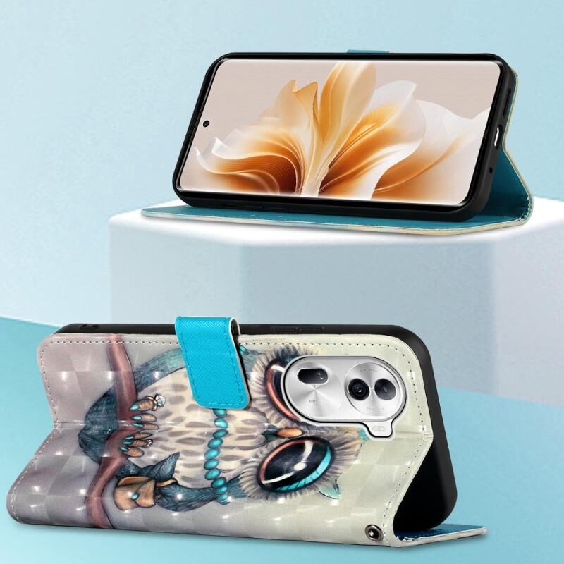 Θήκη τηλεφώνου από δέρμα με οριζόντια αναδίπλωση και τρισδιάστατη ζωγραφική για OPPO Reno11 Pro 5G Global (Γκρι κουκουβάγια)