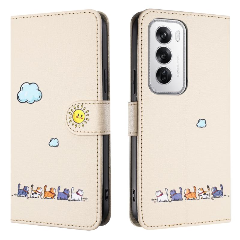 For OPPO Reno12 5G Global Cartoon Cats Leather Phone Case(Beige White)