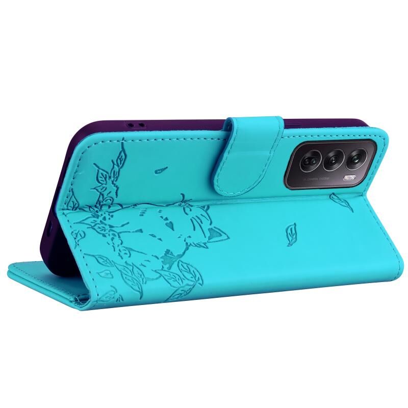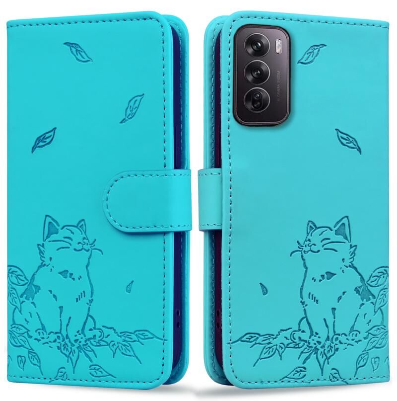 Θήκη τηλεφώνου από δέρμα με ανάγλυφο χαριτωμένο γατάκι για OPPO Reno12 5G Global (Γαλάζια Λίμνης)