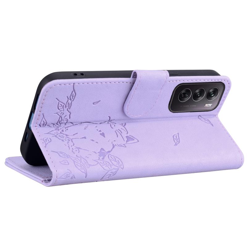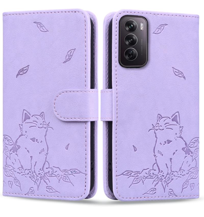 For OPPO Reno12 5G Global Cute Cat Embossed Leather Phone Case(Purple)
