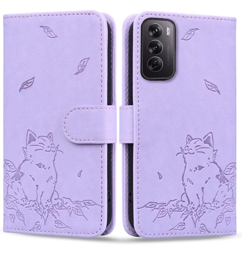 Θήκη τηλεφώνου από δέρμα με ανάγλυφο χαριτωμένο γατάκι για OPPO Reno12 5G Global (Μωβ)
