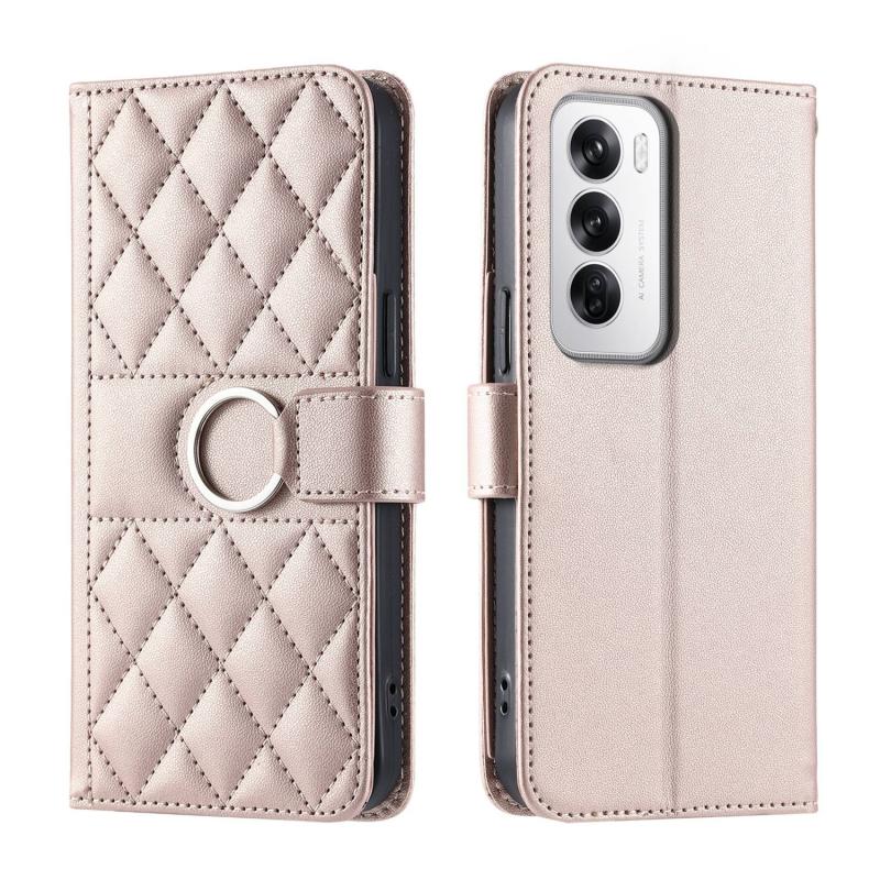 For OPPO Reno12 5G Global Ring Buckle Rhombic Leather Phone Case(Rose Gold)