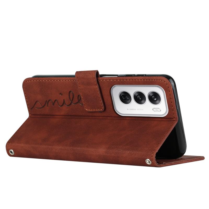 For OPPO Reno12 5G Global Skin Feel Heart Embossed Leather Phone Case with Long Lanyard(Brown)