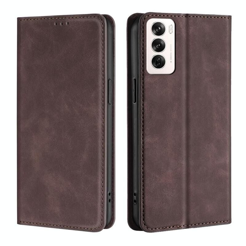 Για OPPO Reno12 5G Global Skin Feel μαγνητική δερμάτινη θήκη τηλεφώνου (σκούρο καφέ)