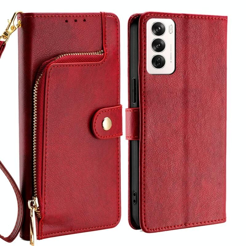 Για OPPO Reno12 5G Παγκόσμια φερμουάρ τσάντα δερμάτινη θήκη τηλεφώνου (Κόκκινο)
