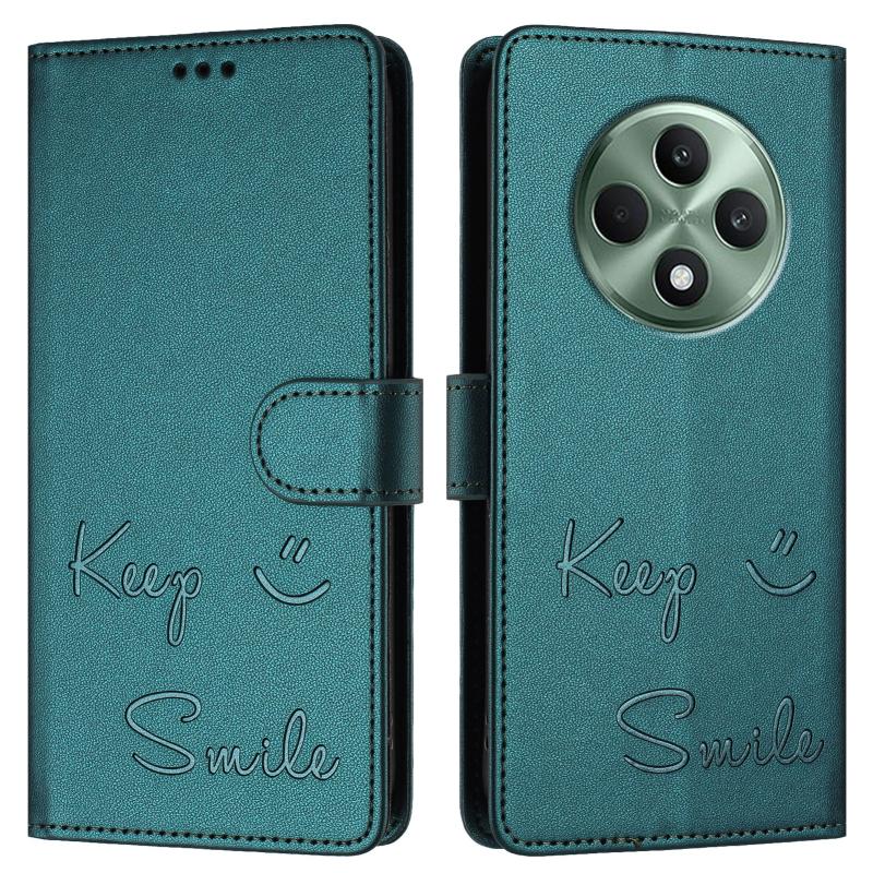 For OPPO Reno12 F 5G Global Smile Embossing RFID Leather Phone Case(Peacock Green)