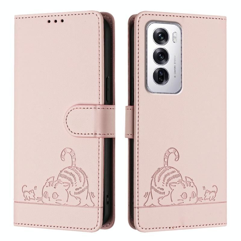Θήκη τηλεφώνου από δέρμα με ανάγλυφο σχέδιο γάτας και ποντικιού για OPPO Reno12 Global με κορδόνι (ρόζ)