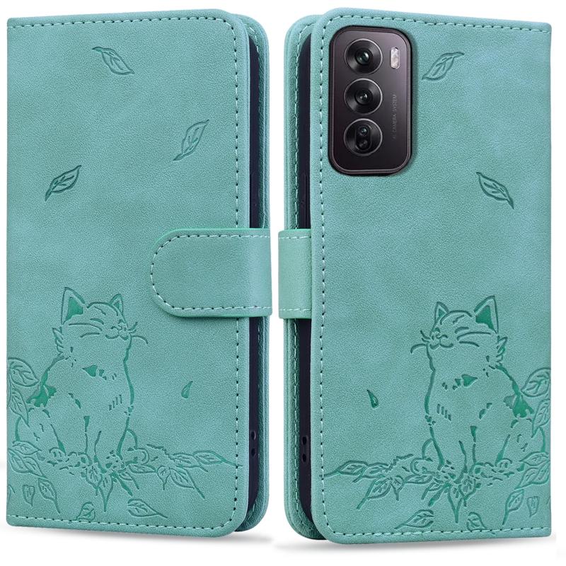 For OPPO Reno12 Pro 5G Global Cute Cat Embossed Leather Phone Case(Green)