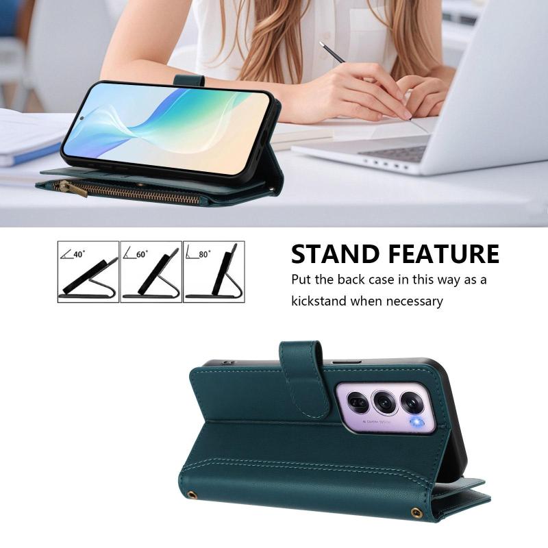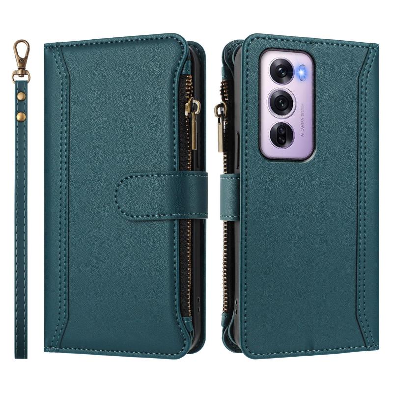 For OPPO Reno12 Pro 5G Global Magnetic Closure 9 Card Slots Zipper Leather Case with Hand Strap(Dark Green)