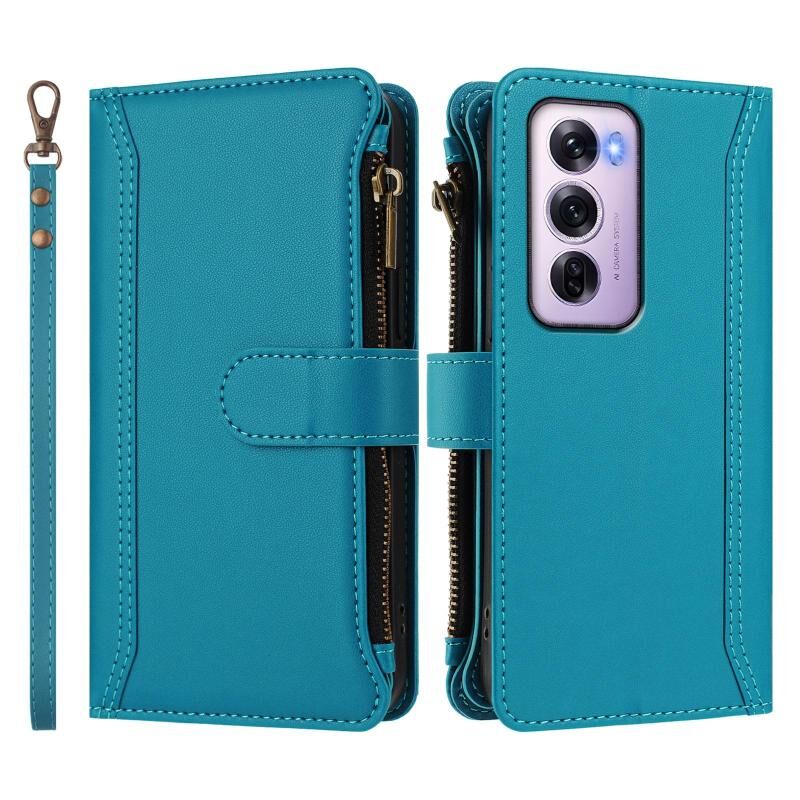Για OPPO Reno12 Pro 5G Global Μαγνητικό Κλείσιμο 9 Θήκες Κάρτας Δερμάτινη Θήκη με Φερμουάρ και Λουρί Χεριού (Τουρκουάζ)