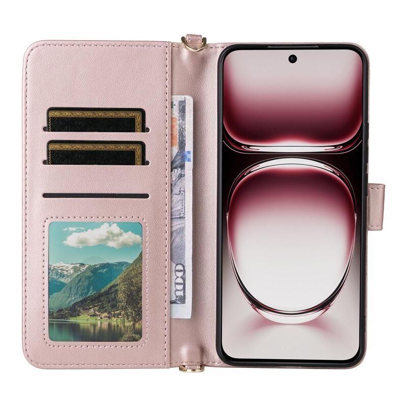 Θήκη τηλεφώνου από δέρμα για OPPO Reno12 Pro 5G Global, πολυλειτουργική με 6 υποδοχές καρτών και λουρί καρπού (Ροζ)