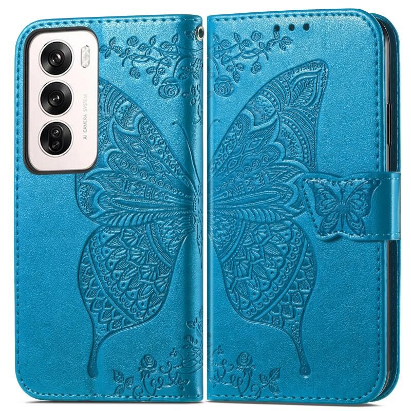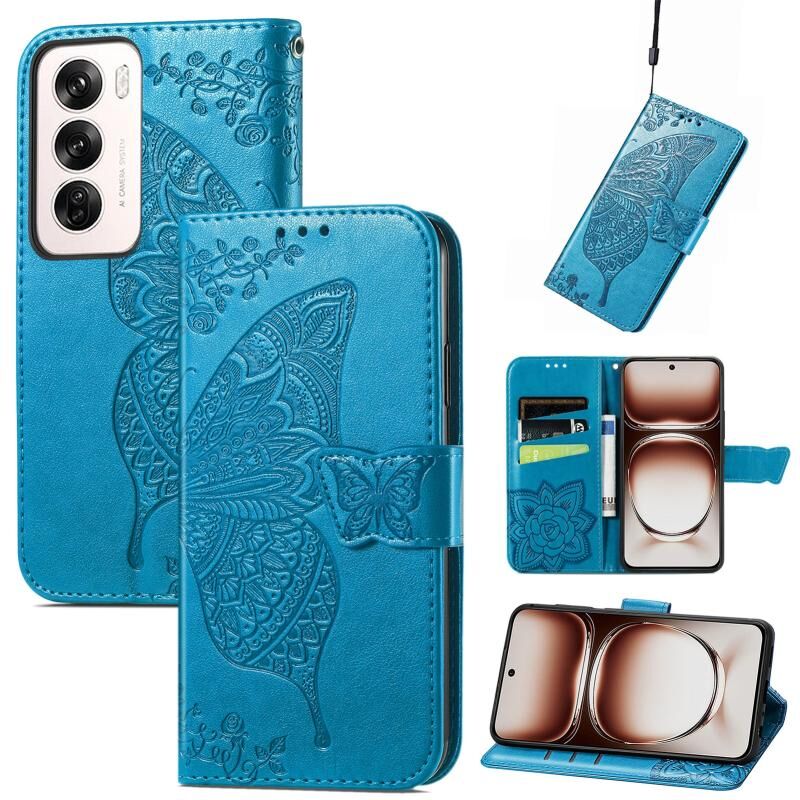 Θήκη τηλεφώνου από δέρμα με ανάγλυφο σχέδιο πεταλούδας και λουλουδιών για OPPO Reno12 Pro Global (Σκούρο Μωβ)